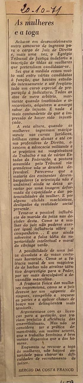 Esse mesmo Procurador, em 20 de outubro de 1971, em crônica no Jornal Correio do Povo, protestava contra o indeferimento da inscrição pelo Tribunal de Justiça de todas as candidatas ao cargo de Juiz de Direito. Segue crônica ilustrativa: